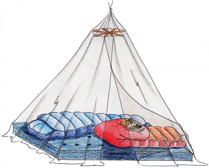 Baldachin aus weißem Polyester Moskitonetz. Komplett mit Aufhängehaken und Aufbewahrungsbeutel. Mit den Komfortmaßen von 2,5 Meter (Höhe) und ca. 11,5 Meter Umfang. Das Netz ist auf einer Seite offen, so dass man – mit einem überlappenden Eingang – bequem unter das Netz schlüpfen kann.