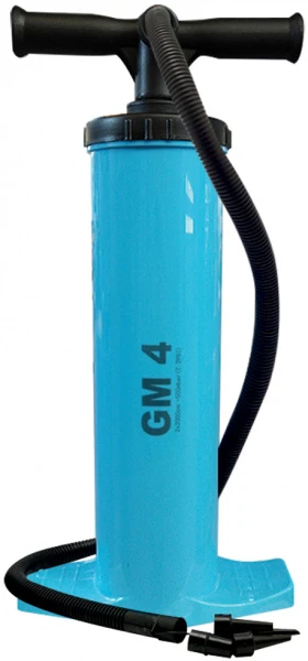 Doppelhub-Handpumpe mit 2x 2,0 Liter Leistung für Schlauchboote (Dinghis ohne aufblasbaren Boden) bis ca. 4-5 m, Kajaks, Tubes, Fender, aufblasbares Strandspielzeug. Luftdruck max. 0,5 bar. Maße: ca. 11 x 22 x 47 cm. Im Lieferumfang sind Schlauch und ein 4-tlg. Adapterset enthalten.