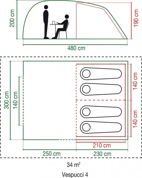 Geräumiges Familien-Tunnelzelt mit großer Schlafkabine (210x280x140 cm – teilbar auf zwei Kabinen mit je 140 cm Breite), Wohn- (250x300x190 cm) und Schlafbereich bieten volle Kopfhöhe. Zwei Eingänge. Das Außenzelt wird zuerst aufgebaut und die Kabinen entsprechend eingehängt.