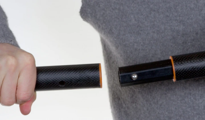 Zweiteiliges, wunderschönes Grönlandpaddel. Das Paddel besteht aus insgesamt 13 sorgfältig angepassten Hölzern. Die Teilung besteht aus Carbon. Die Verbindungsfuge zum Blatt ist oval und zu 100% bündig. Die Teilung ist als Sechskant geformt, die mit einem Federstecker gesichert ist. Einfach und langlebig. Aufgrund des Sechsecks entsteht im Laufe der Zeit kein Spiel.