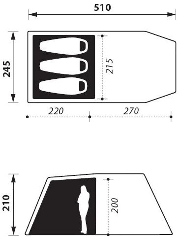 Das Innenzelt verfügt über eine Schlafkabine (4,6 m²) für 3 Personen. Ausstattung: eine Tür und einen Nebeneingang für beste Belüftung, Panorama-Fenster mit Vorhängen auf der Innenseite, integrierter Zeltboden, Elektrokabelöffnung als funktionelles Extra. Kurze Stangenkanäle und das Ring-Stift-Systemen erleichtern den Aufbau. Abgerundet wird der Komfort durch ein Organizerregal und eine Kleiderstange.