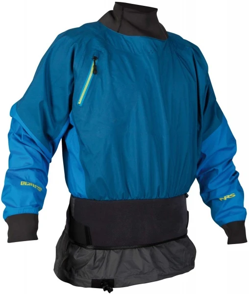 Der GlideSkin™ Neoprenhalsabschluß hält gut dicht und ist komfortabel zu tragen, die Latexmanschetten an den Ärmeln sind abgedeckt, eine kleine Tasche bietet Platz für Nasenklammer oder ähnliches. Der Dopppelkamin mit dem leichten Innenteil aus Ripstop Nylon und dem beidseitig mit Klett verstellbaren Neoprenaußenbund sorgt für eine gute Verbindung zur Spritzdecke, so bleibt es auch im Boot länger trocken.