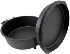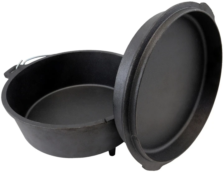 Vollständig aus Gusseisen gefertigt und sehr robust. Der Feuertopf, der vom „Grapen“ abstammt und als Dutch Oven bekannt geworden ist, eignet sich hervorragend zum Kochen im Freien. Er kann direkt in offenes Feuer gestellt werden. Die exzellente Wärmeleitung und seine Wärmespeicherung über einen langen Zeitraum sowie die extreme Robustheit zeichnen diesen Topf aus. Seine Verwendungsmöglichkeiten sind sehr vielseitig. Mit ihm können Sie kochen, schmoren, braten, frittieren und sogar backen. Dank der seitlichen Thermometerdurchführung lässt sich die Temperatur im Inneren jederzeit kontrollieren. Der Deckel des Feuertopfs kann zudem auch als Servierplatte oder Pfanne genutzt werden. Dank der vorbehandelten Oberfläche können Sie den Feuertopf sofort einsetzen.