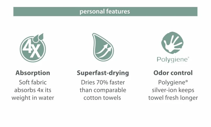 Ultraweiches und glattes Sport- und Reisehandtuch aus Microfaser. Das Handtuch bietet den perfekten Ausgleich zwischen Weichheit, Saugfähigkeit und Trocknungsdauer. Daher ist es ideal für Reisen, Camping, Wassersport und täglichen Sport im Fitnesscenter – kurz gesagt, es ist das ideale Allzwecktuch. Trocknet 70 % schneller als vergleichbare Handtücher aus Baumwolle. Die Polygiene® Ausrüstung ist geruchsmindernd durch umweltfreundliche Silberionen.