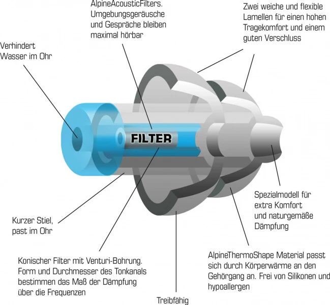 ATS-Material (thermoplastisches Material ohne Silikone). Set besteht aus 2 Ohrstöpseln, 1 Minibox, 1x Kunststoff Aufbewahrungsschachtel 10 x 8 x 2 cm, 2x akustische Filter, 1x Einführhülse. 34 g.