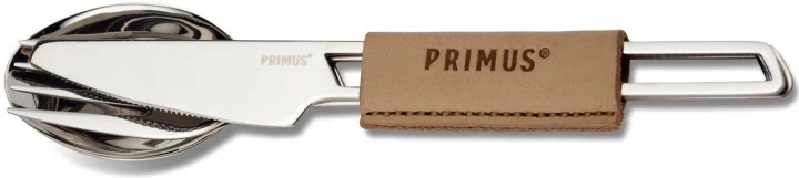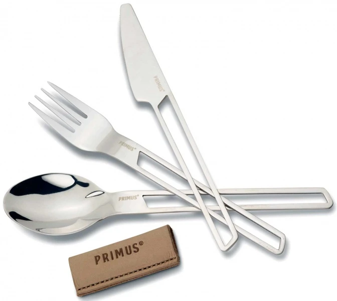 Schönes Besteckset auch passend zur Primus Campfire Serie mit Löffel, Gabel und Messer aus hochwertigem Edelstahl in schickem und praktischem Design. Das Lederformstück hält das Set klapperfrei und sicher zusammen und passt zum Stil.