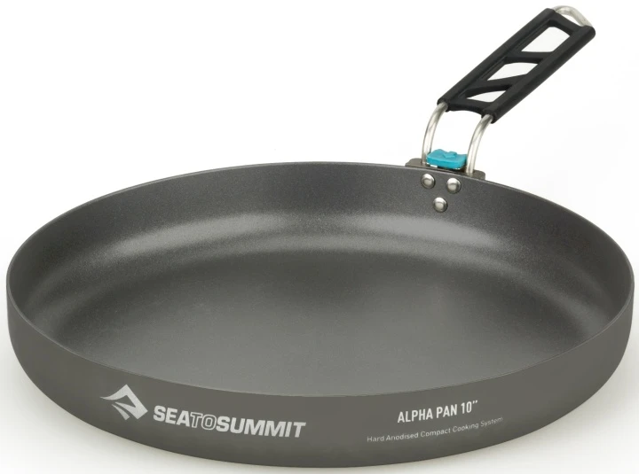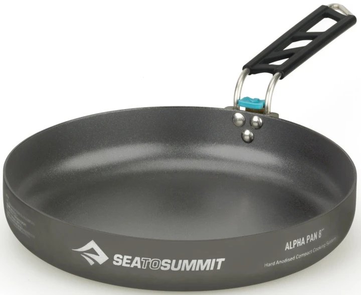 Ergonomischer Klappgriff mit Sicherheitsverriegelung, klappt bei Nichtgebrauch unter die Pfanne, um kompaktes Lagern zu ermöglichen. Die 8er AlphaPan passt perfekt um die Basis der 2,7 Alpha Töpfe. Hartanodisierte Aluminiumlegierung, Silikongriff aus rostfreiem Stahl.