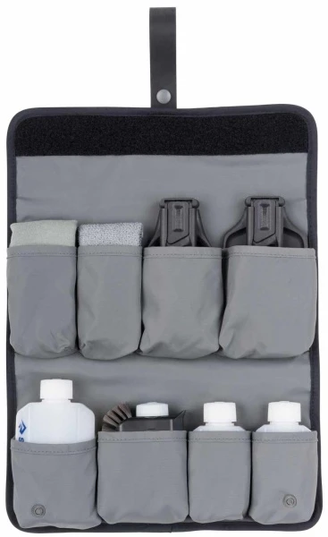 Das Set beinhaltet: Folding Spatula, Folding Serving Spoon, Pot Scrubber, 50ml Wilderness Wash, 2x 50 ml + 1x 100 ml wiederverwendbare Gewürz-/Ölflaschen, Doppelseitiger Waschlappen, DryLite Geschirrtuch, Aufhängbare Nylon-Rolltasche.