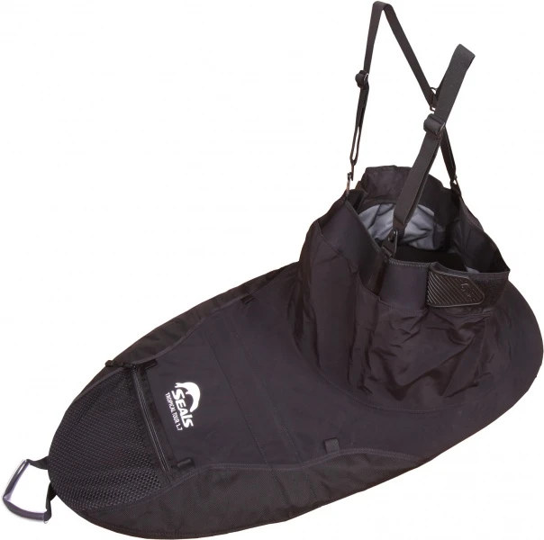 Spritzdecke aus atmungsaktivem 3-Lagen Laminat. „Rim-Grip“ Süllrandabschluss mit rutschhemmender Oberfläche und verstellbarem Gummizug. In den Spritzdeckenteller ist ein auf der Innenseite spannbarer Bügel angebracht, dieser sorgt für einen weitestgehend faltenfreien Sitz der Decke und verhindert die „Pfützenbildung“ auf dem Teller.